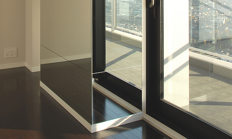 オーダーメイドだからできるデザイン貼りなど色付きミラーを用いて、『見せるミラー』でリビングも華やかに彩ってみましょう。